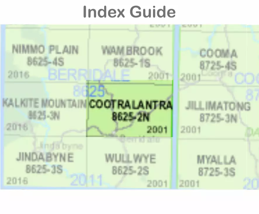The Cootralantra 8625-2-N 1:25,000 scale New South Wales topographic map shows contours, streams, roads, tracks, buildings, place names, points of interest, vegetation, selected administrative boundaries and much more.