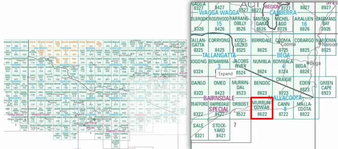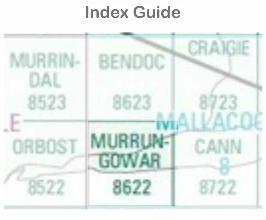 1:100,000 Scale Topographic Map by Natmap (Australian Government). Detail at 1cm to 1km. Land features, watercourses roads and tracks.