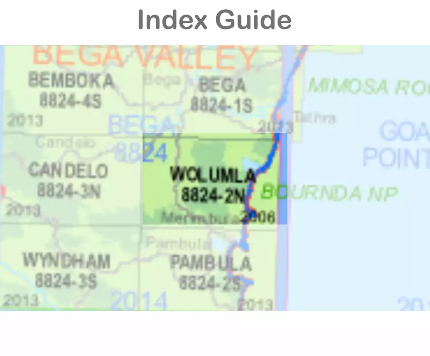 The Wolumla 8824-2-N 1:25,000 scale New South Wales topographic map shows contours, streams, roads, tracks, buildings, place names, points of interest, vegetation, selected administrative boundaries and much more.