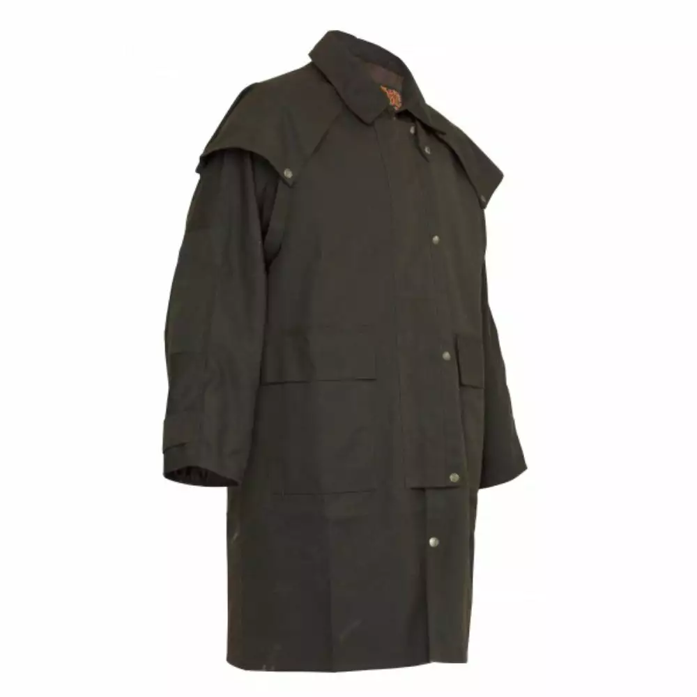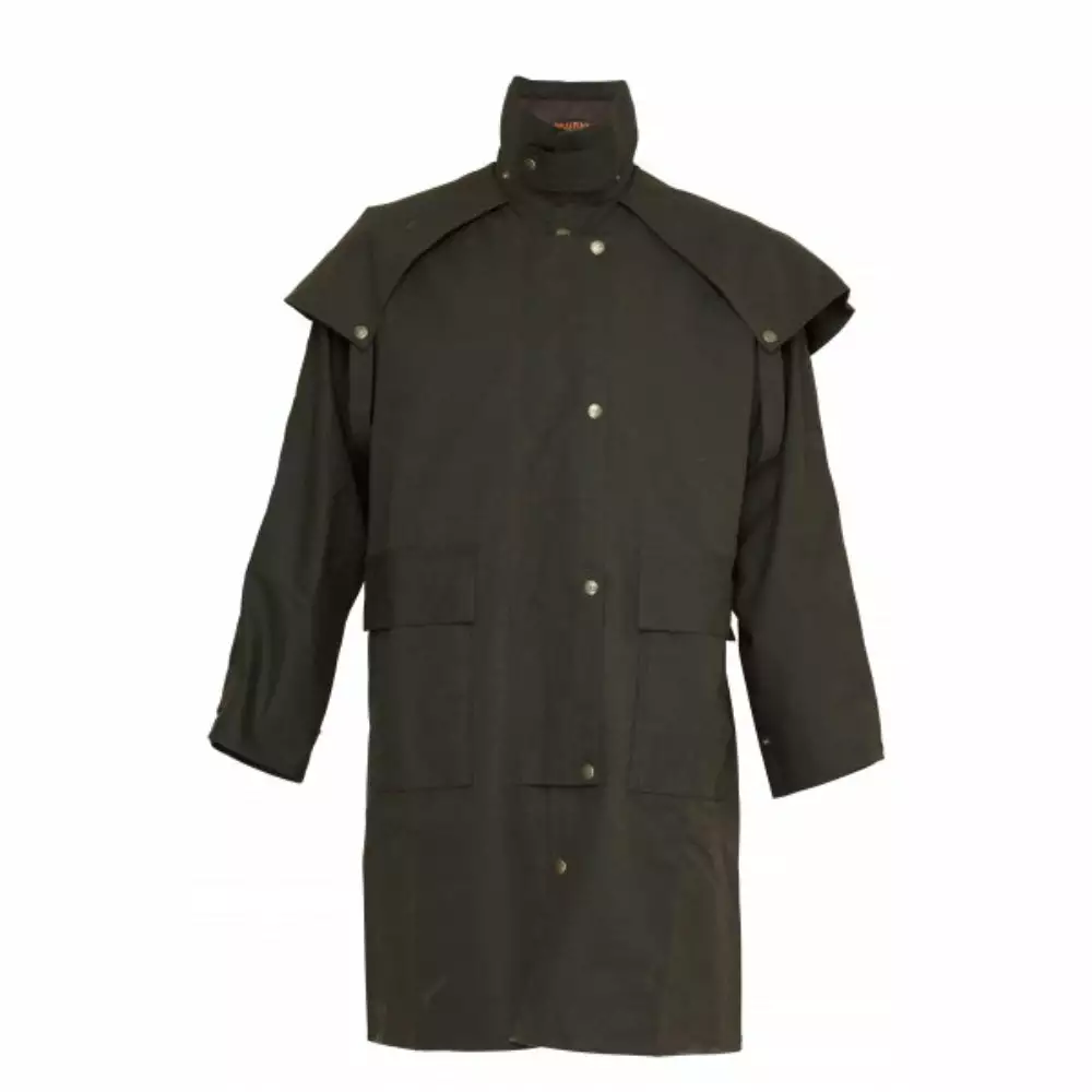 A very practical working coat, the Balranald allows increased movement and flexibility. Constructed from our popular Dritec™ heavyweight Oilskin cotton, this coat is extremely durable and waterproof. Features include our signature cape, deep front pockets, reinforced elbow patches, back vent and the option to attach an Oilskin hood and Sherpa lining.