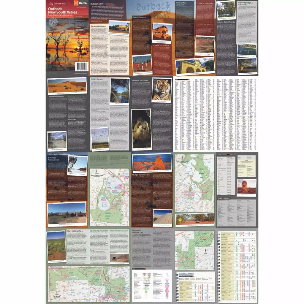 A regional map of outback NSW (1:1,100,000) that ranges from Tamworth in the east to Broken Hill in the west, as well as from Wagga Wagga in the south to past the Queensland border in the north. On the opposite side is extensive information on numerous regions, including visitor, historical and background information. Covered regions include the Broken Hill region, Corner Country, east of Tibooburra, the White Cliffs region, Cobar and surrounds, around Back o’Bourke, Lightning ridge and surrounds, Wentworth region, Balranald, Griffith region, Dubbo and surrounds, Kinchega National Park, Mungo National Park, Sturt National Park and Mutawintji National Park.