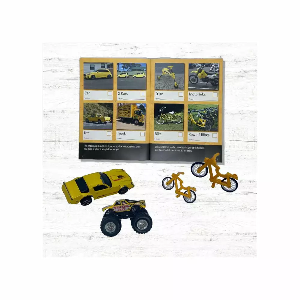 SPOTTO CLASSIC can be used daily, every time you’re in the car. It has stemmed from the age old classic SPOTTO game. Every time you see a yellow car you call out SPOTTO. CLASSIC Spotto includes yellow cars, yellow buses, yellow trucks, yellow bikes, yellow boats, yellow signs, and many random yellow things. There are 88 yellow pictures to spot, it will keep you looking out the window and help time fly. Will you spot them all?
