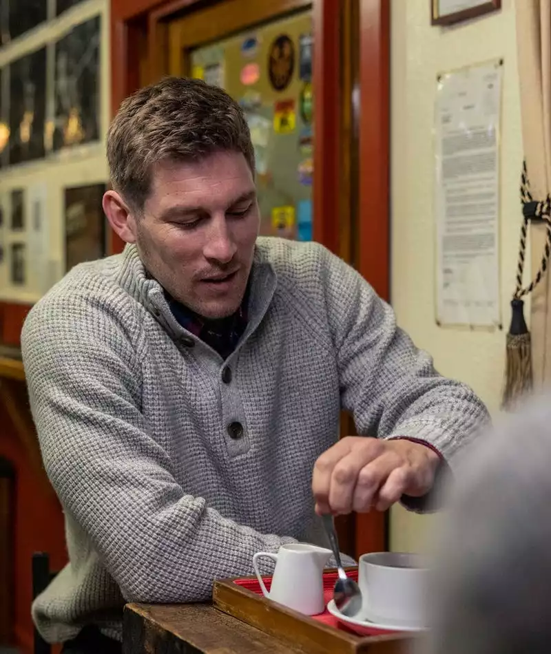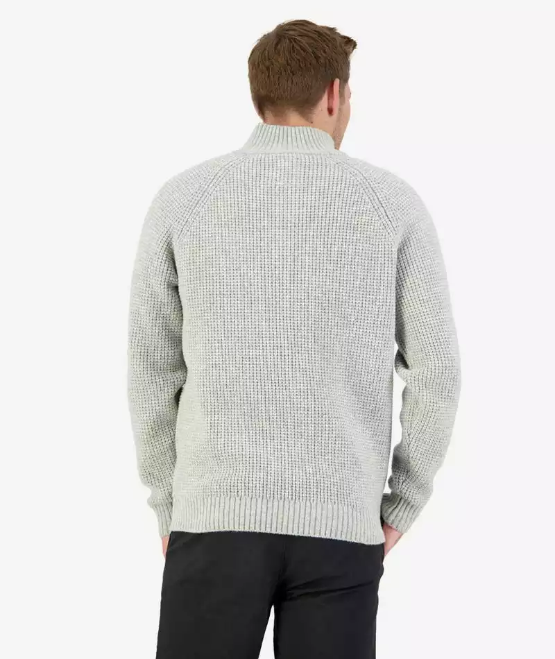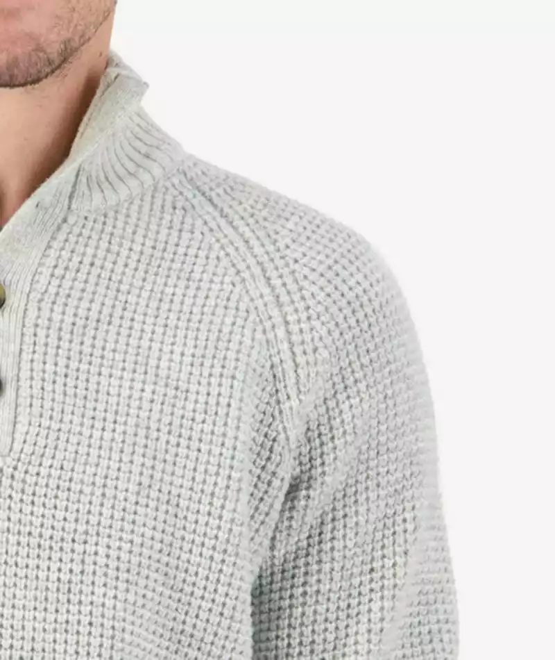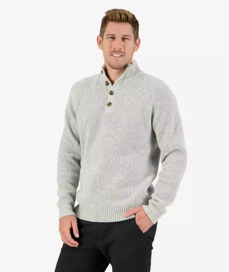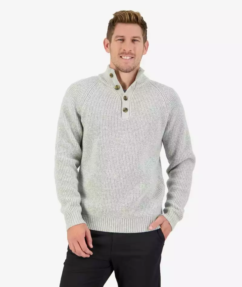 Button neck lambs wool blend jumper knitted in a heavy waffle texture. Perfect for the winter months under a jacket or as a layer on its own.